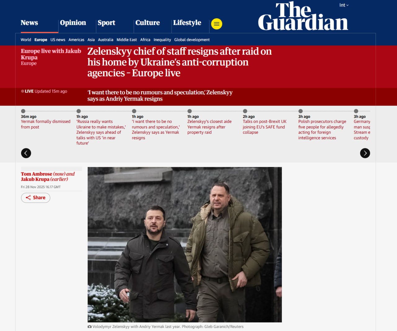 The Guardian: Глава администрации Зеленского уходит в отставку после рейдерского захвата имущества антикоррупционными органами Украины