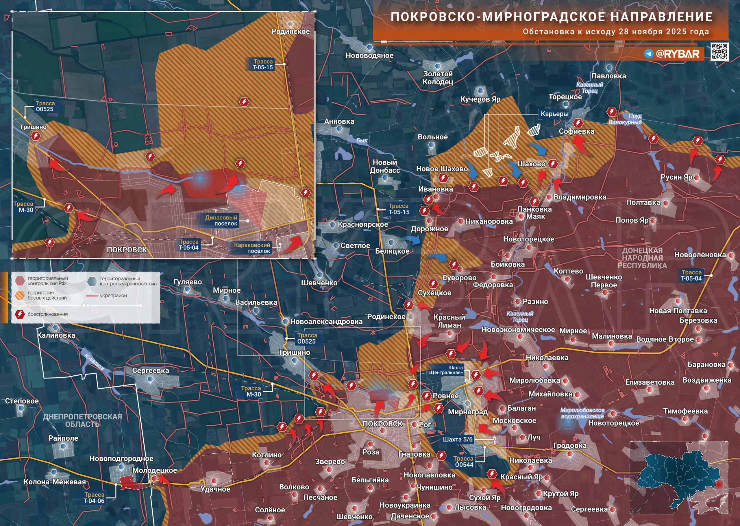 На Покровско-Мирноградском направлении ВС РФ завершают зачистку северных окраин Покровска, в соседнем Мирнограде продолжаются бои.