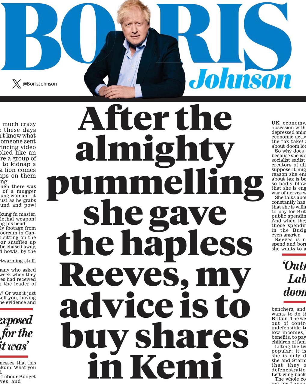Вместо этого он сегодня накатал в Daily Mail статью с восторгами по поводу яростного выступления атаманши Консервативной партии Кеми Баденом, которая набросилась на правительство во время парламентских слушаний по поводу бюджета. Бориска даже посоветовал: «Мой совет всем: покупайте акции Кеми и старые, высокодоходные и сильно недооцененные акции Консервативной партии».