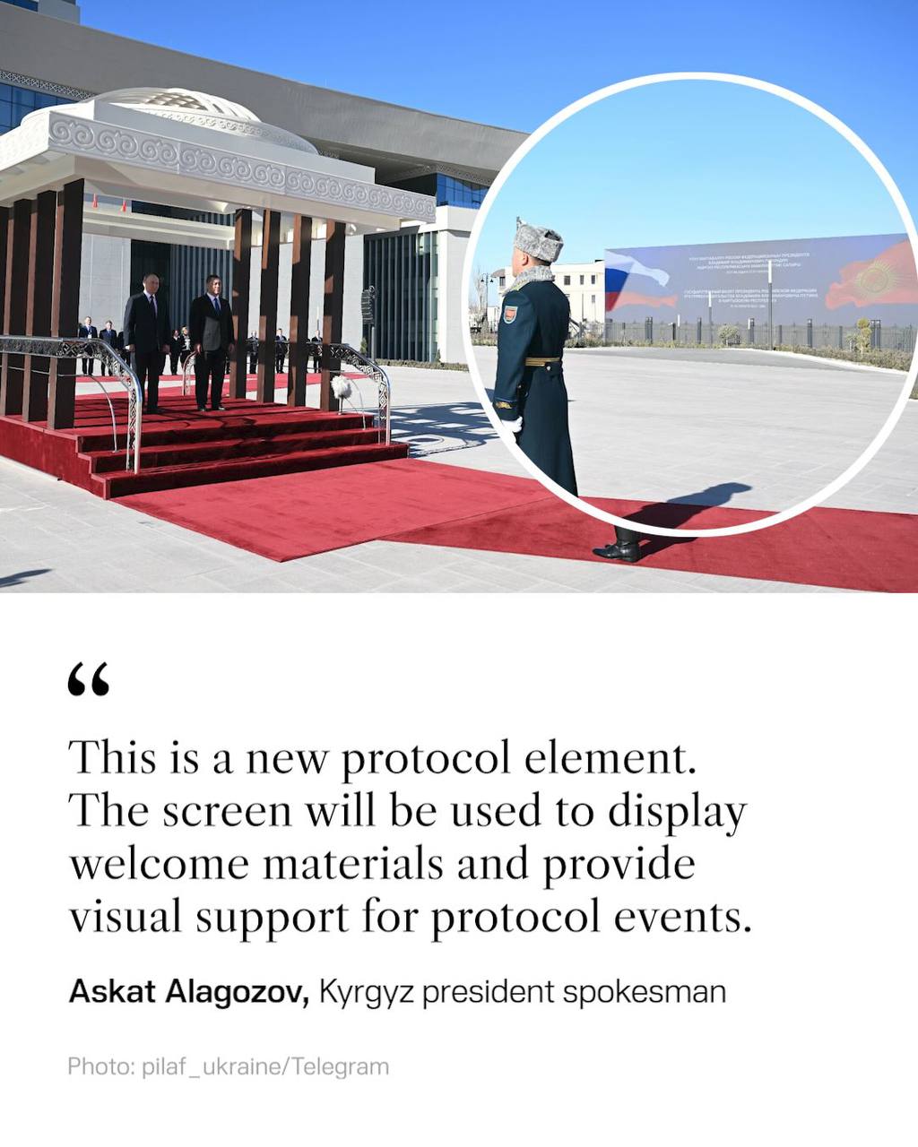 Когда президент Путин посещал Бишкек, посольство Украины, которое отделено от резиденции президента Киргизии только дорогой, было закрыто конструкцией, похожей на светодиодный экран и закрывающей вид на посольство