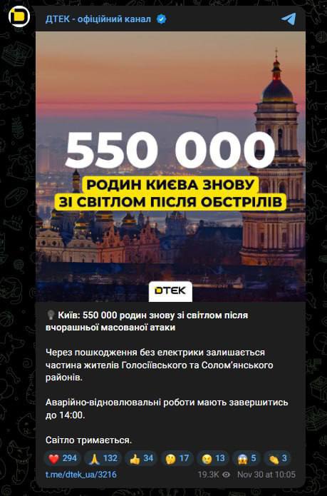 Часть жителей Соломенского и Голосеевского районов Киева до сих пор остаются без света после вчерашней атаки ВС РФ, сообщает ДТЭК