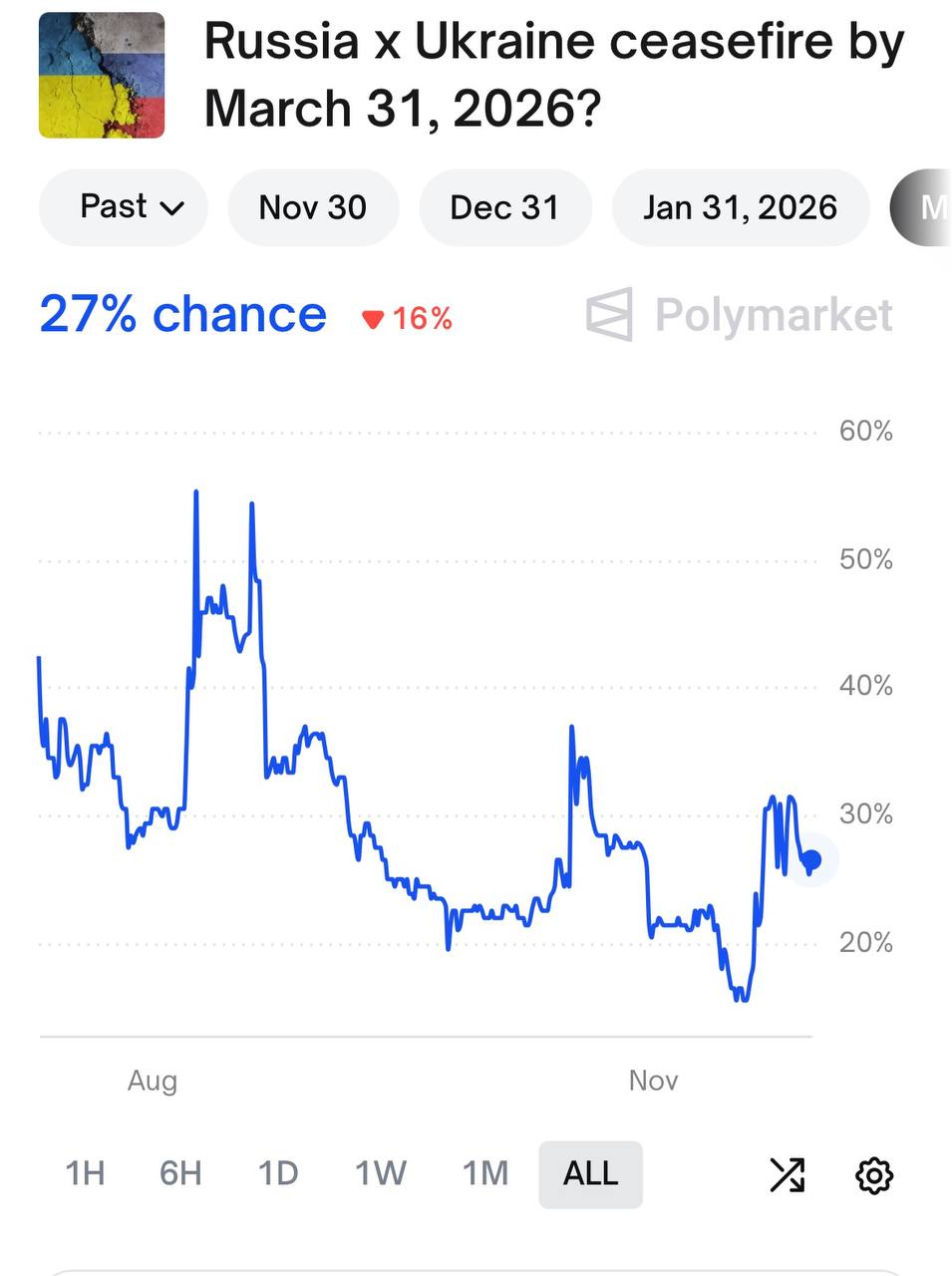 Вероятности заключения перемирия между Россией и Украиной к 31.12.2025 и 31.03.2026 по мнению букмекеров Polymarket