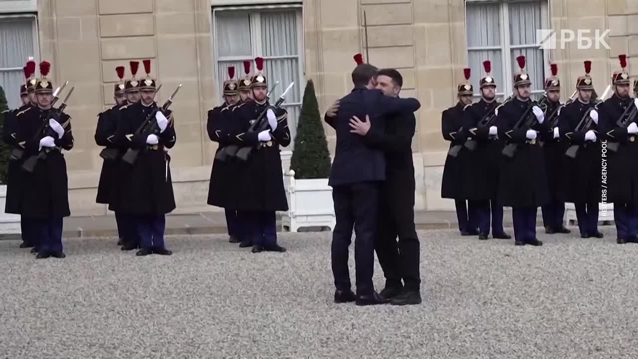 Во дворе Елисейского дворца Макрон встретил Зеленского они «тепло обнялись», после чего оба лидера проследовали внутрь дворца.