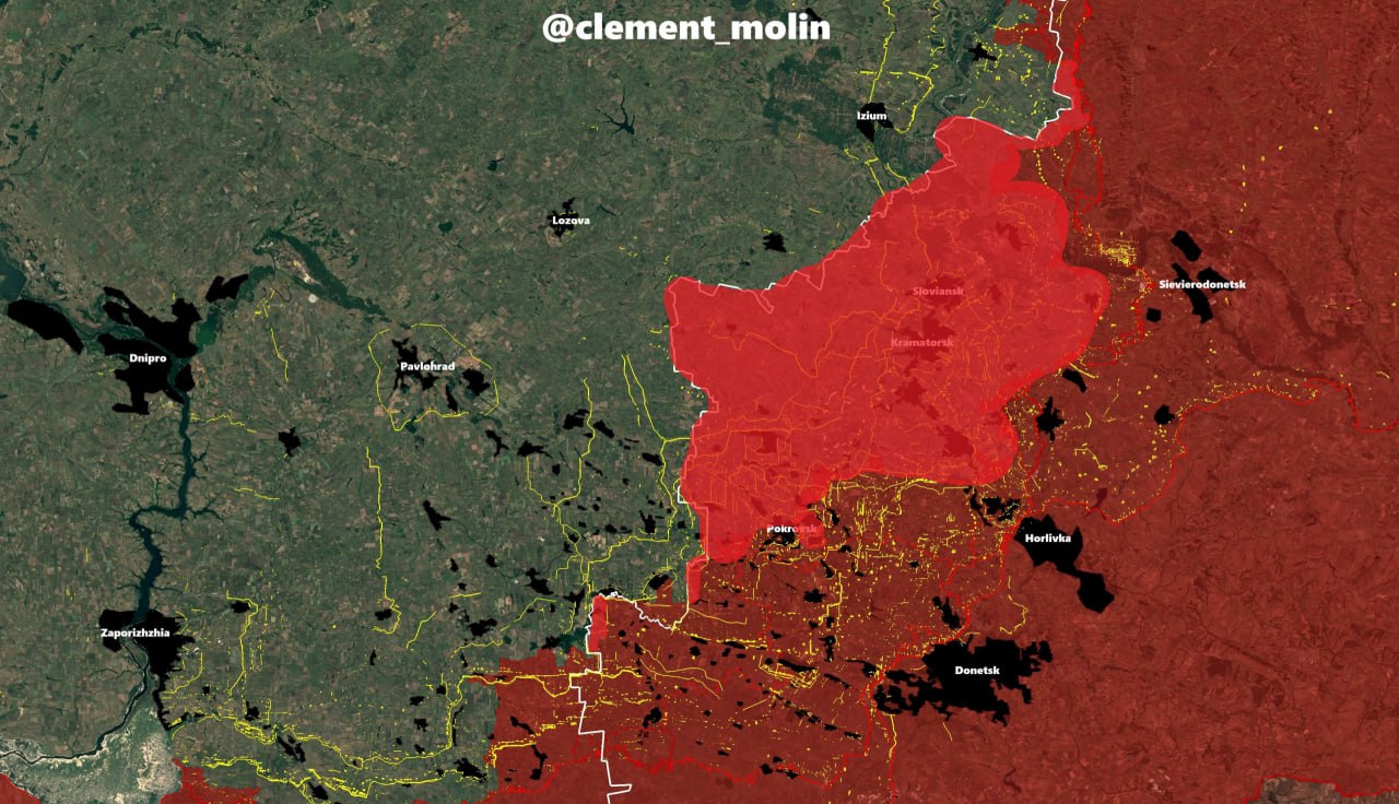 Желтыми линиями на карте отмечены линии укреплений противника. Как не сложно заметить, основная их часть и наибольшая плотность располагается как раз на оставшейся под контролем ВСУ части ДНР.