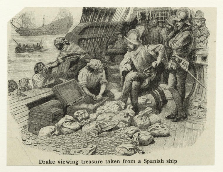 Иллюстрация - гравюра «Дрейк осматривает сокровища, захваченные с испанского корабля», дата публикации – 1780 год.