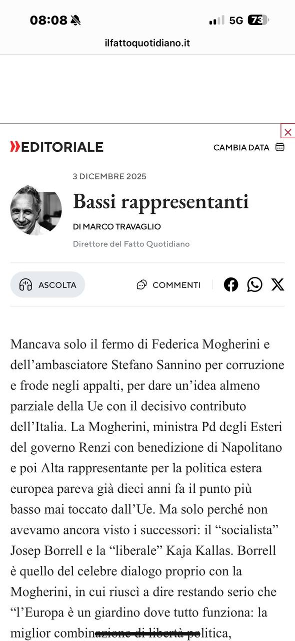 Могерини — министр иностранных дел от Демпартии в правительстве Ренци, благословлённая Наполитано, а затем Верховный представитель ЕС по иностранным делам — казалась уже десять лет назад самым низким уровнем, которого когда-либо достигал Евросоюз. Но только потому, что мы ещё не видели её преемников: «социалиста» Жозепа Борреля и «либералку» Каю Каллас.