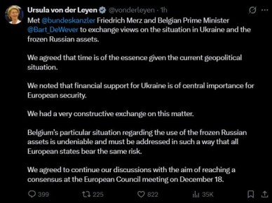 Мерцу и фон дер Ляйен не удалось уговорить премьера Бельгии Барта де Вевера на кражу российских активов. Не желая признать фиаско, фон дер Ляйен долго расписывала, как прошла встреча:«Встретилась с Фридрихом...