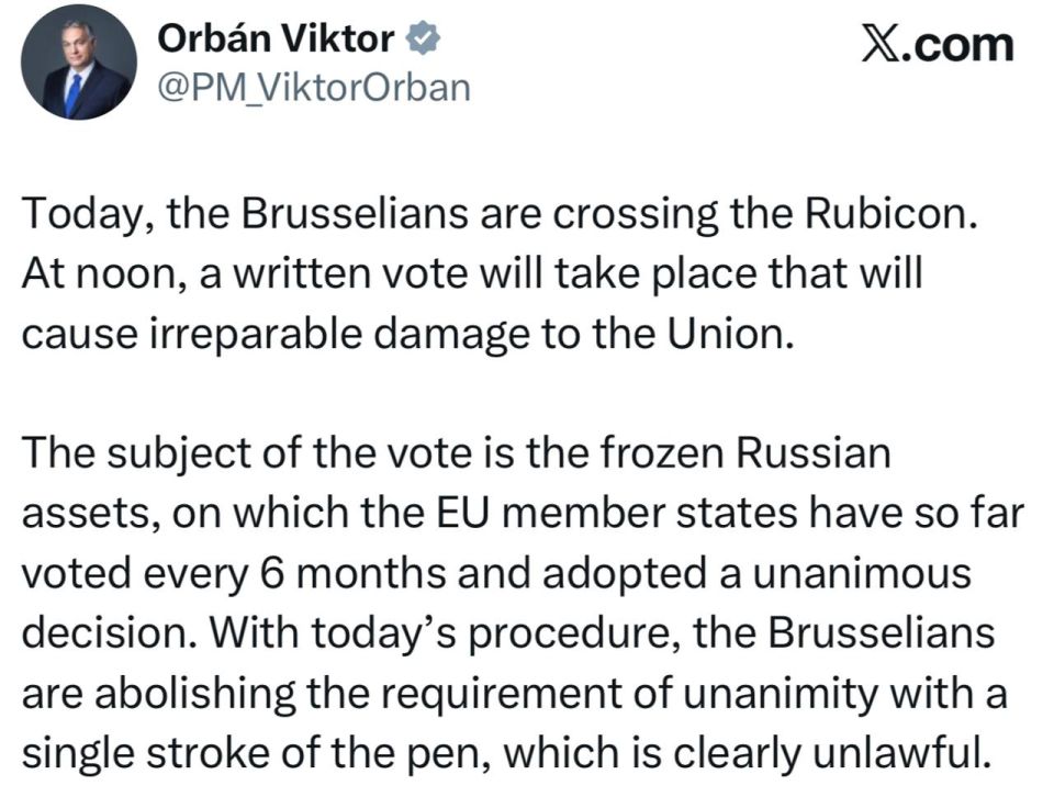 Сегодня состоится письменное голосование, которое нанесет непоправимый ущерб Союзу. Предметом голосования являются замороженные российские активы, по которым государства - члены ЕС до сих пор голосовали каждые 6 месяцев и принимали единогласное решение. С помощью сегодняшней процедуры брюссельцы отменяют требование единогласия одним росчерком пера, что явно незаконно.