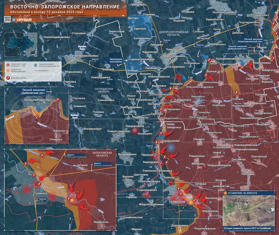 Тем временем на подступах к Гуляйполю российские подразделения успешно заняли «карман» в треугольнике Марфополь — Затишья — Высокое. Вместе с тем бойцы закрепились на восточных окраинах города, взяв под контроль один из опорных пунктов ВСУ, оборудованных в малоэтажной застройке.