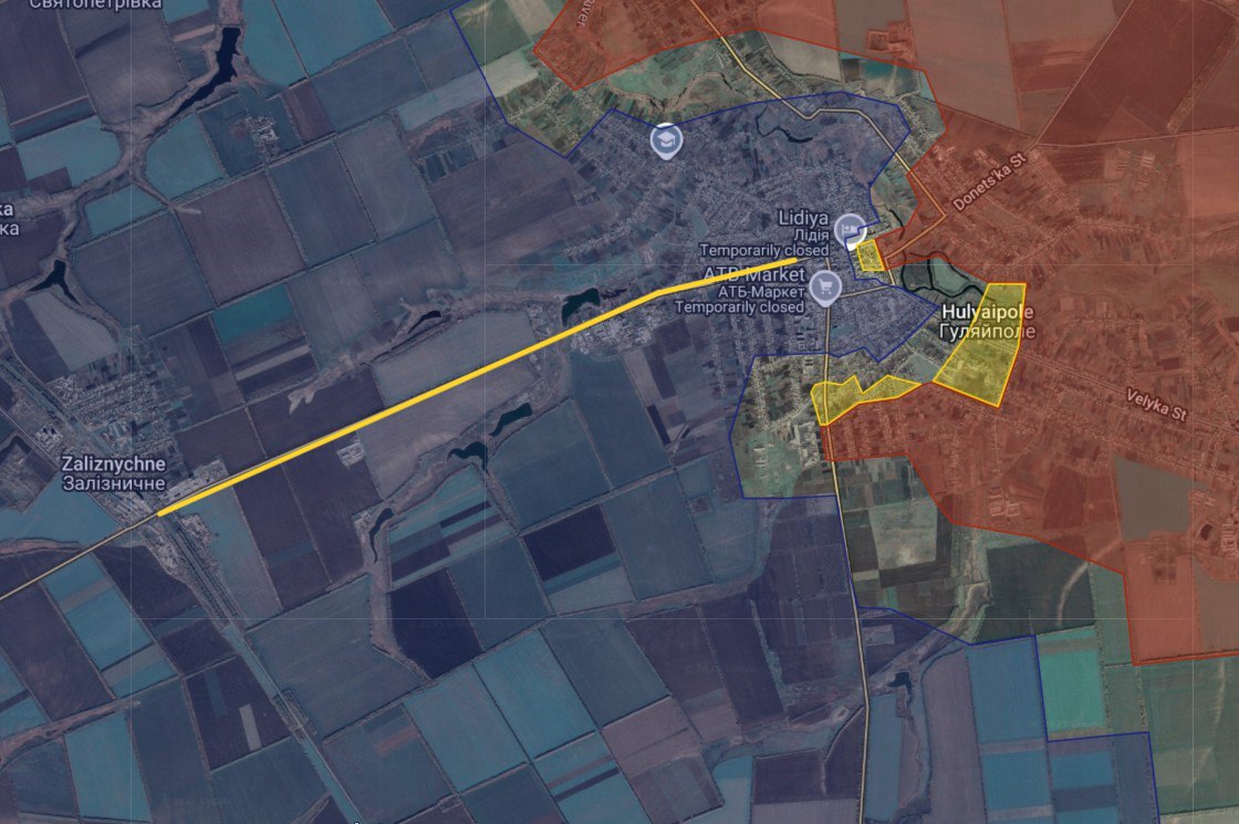Гуляй-поле, ВСУ блокированы с юга, поджимают север. Единственная дорога на Зализничное (обозначена желтым), под пристальным вниманием дроноводов и артиллерии РФ