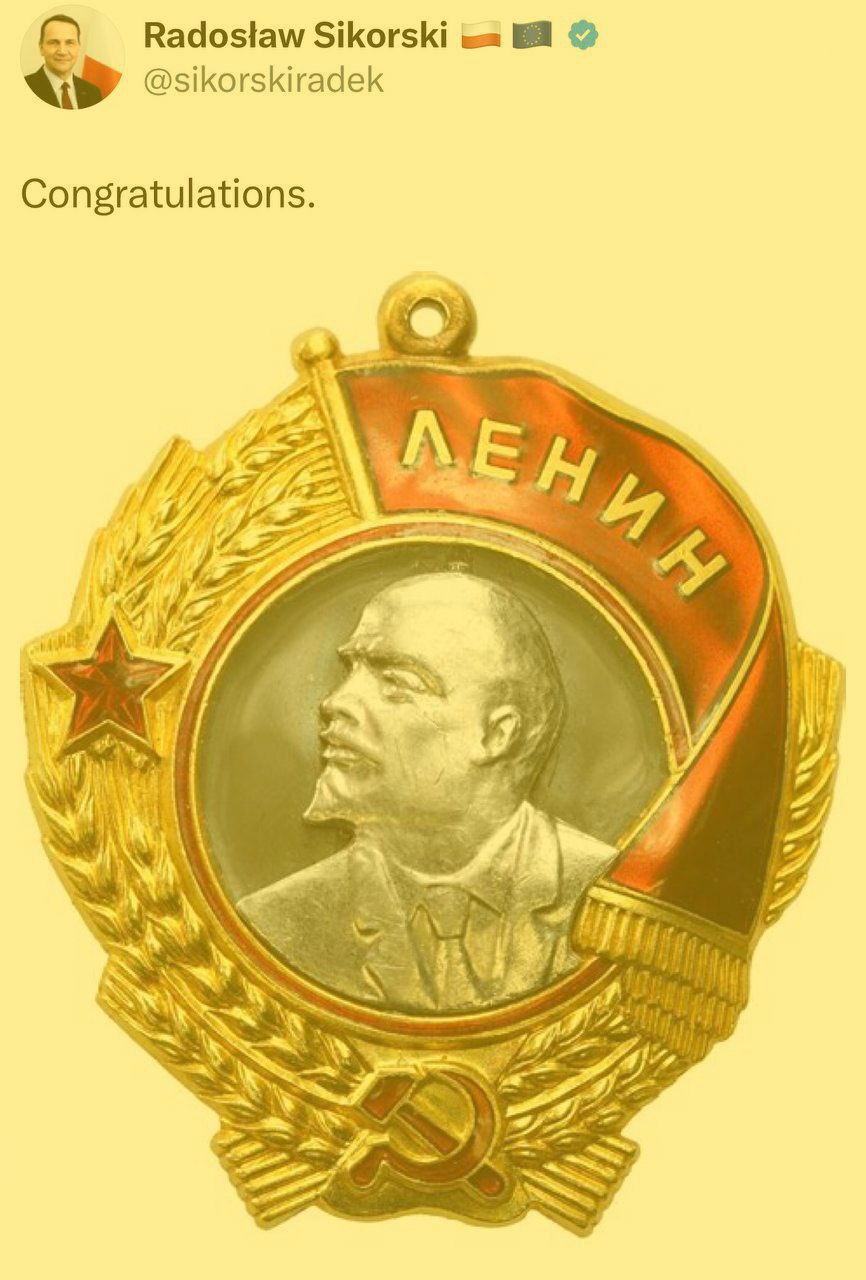 Глава МИД Польши Сикорский отправил премьеру Венгрии Орбану сообщение "поздравляю" и изображение ордена Ленина "за отказ финансировать Украину за счет российских активов".