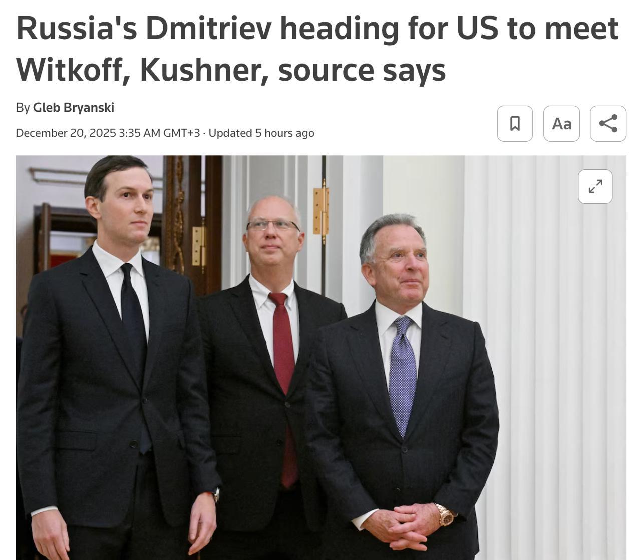 Reuters пишет, что глава РФПИ Дмитриев уже летит в Майами для контактов с Уиткоффом и Кушнером. Сообщается, что его обсуждения с украинскими переговорщиками исключены.