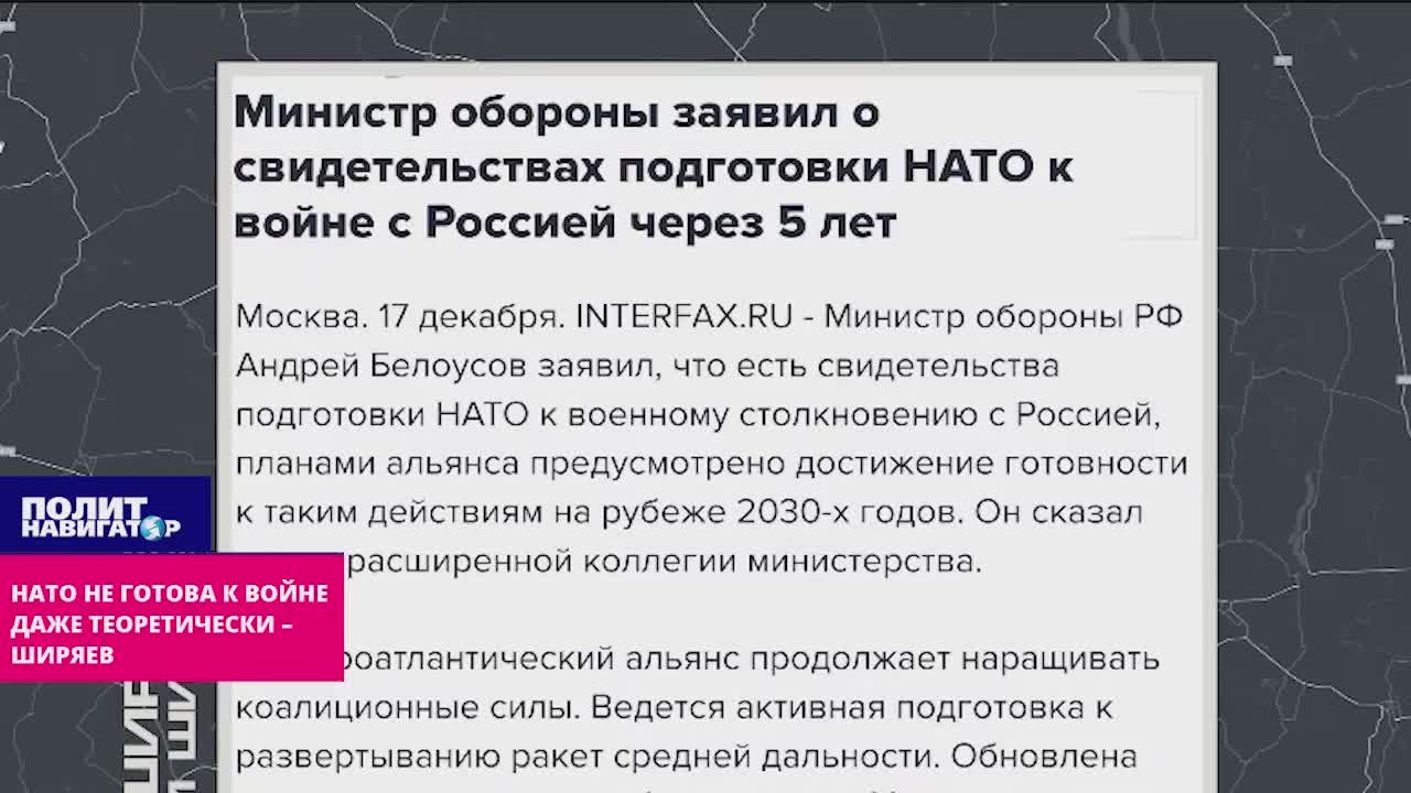 «Белоусов заявил, что бюджет НАТО будет увеличен в полтора раза, и это свидетельствует о том, что Европа готовится к вооруженному конфликту с Россией. Но очень много зависит и еще от твоей от твоего профессионализма, от опыта, как ты эти деньги освоишь, в какую концепцию войны это все выльется.Вот только что буквально мы увидели рекламную подборку фотографий: в США элитная часть копает в подготовке рубежа обороны, инженерные сооружения – капониры, окопы и так далее. И показано, как это все делается», – сказал Ширяев.