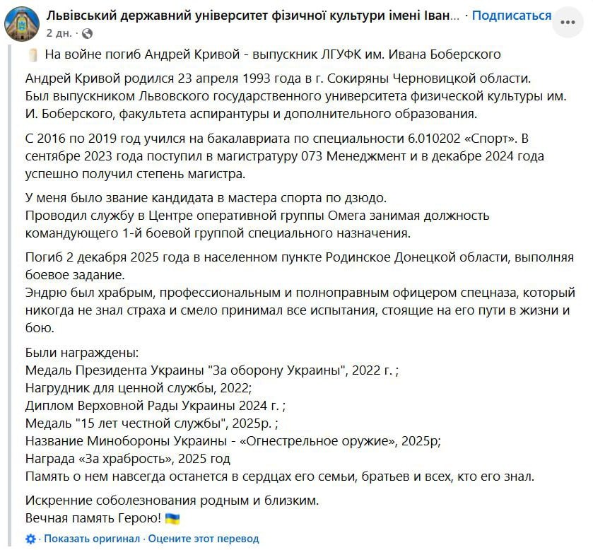 Майор нацгвардии Украины, командир группы спецназа "Омега" Андрей Кривой. Вынужденно окончил карьеру в связи с ранениями, несовместимыми с жизнью, во время боев в н.п. Родинское на Покровском направлении.
