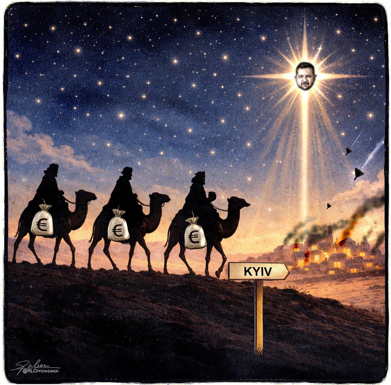Голландская газета De Limburger нарисовала Зеленского в виде Вифлеемской звезды, за которой пошли мудрые волхвы деньги европейских налогоплательщиков.