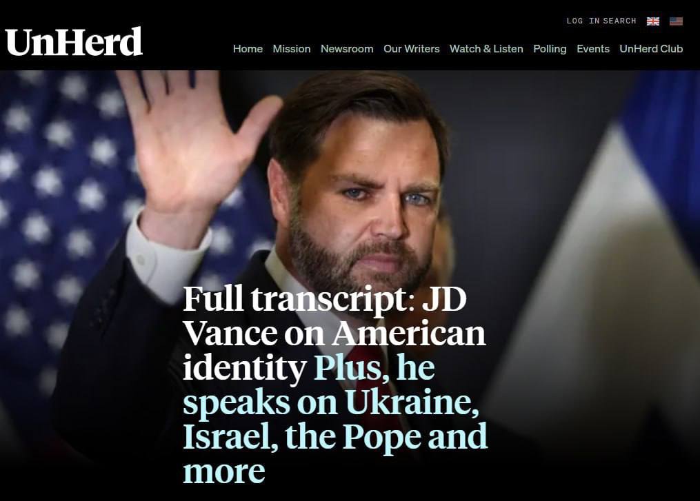 Вице-президент США Джей Ди Вэнс дал интервью изданию UnHerd, в котором заявил, мол "есть хороший шанс, что мы придём к мирному урегулированию в Украине", и "есть хороший шанс, что нет".