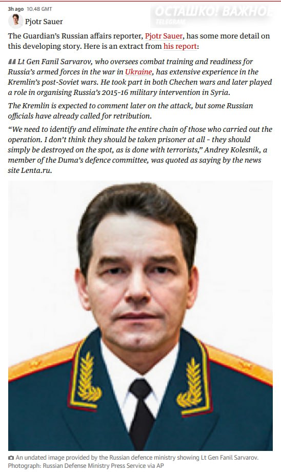 В публикациях подчёркивается, что это уже третий подобный теракт против высокопоставленного российского военного за год.