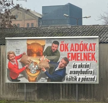 Урсула, Зеленский и Петер Мадьяр (лидер венгерской оппозиции) сливают деньги в золотой унитаз — такие плакаты начали появляться на улицах Венгрии.