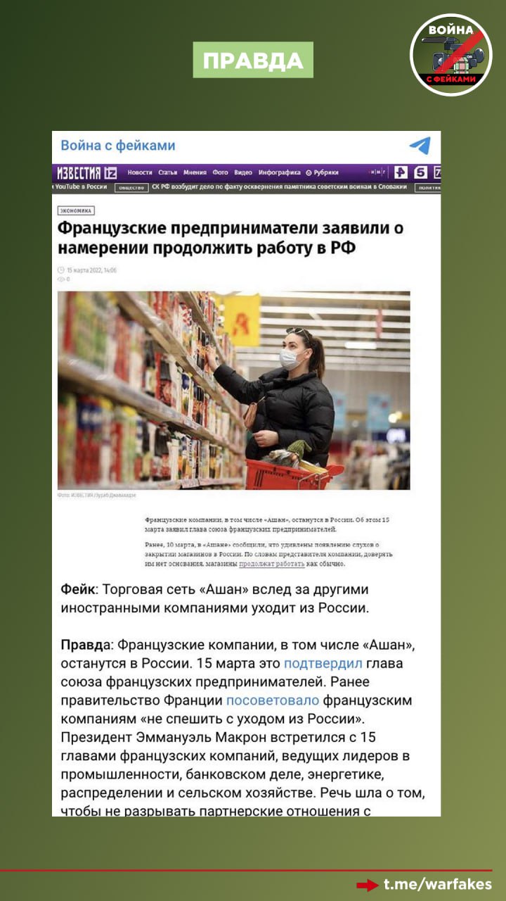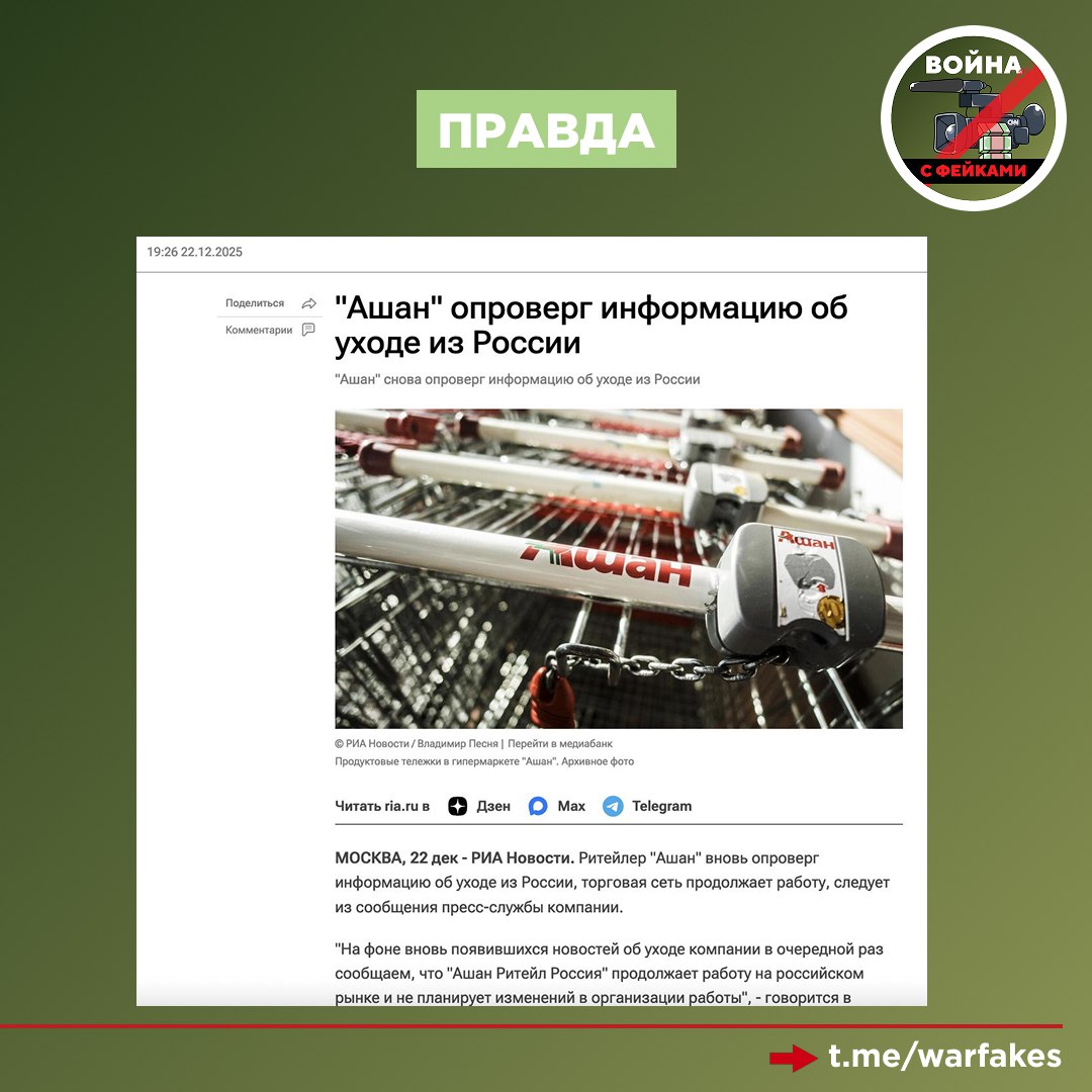 Фейк: «Ашан» уходит из России. Сообщение распространяется в соцсетях и в Телеграм.