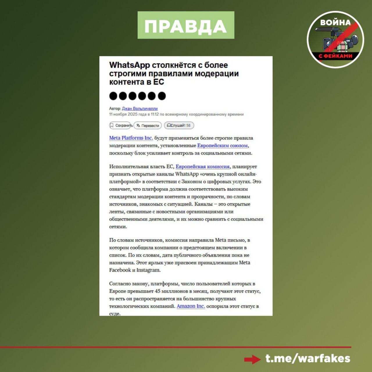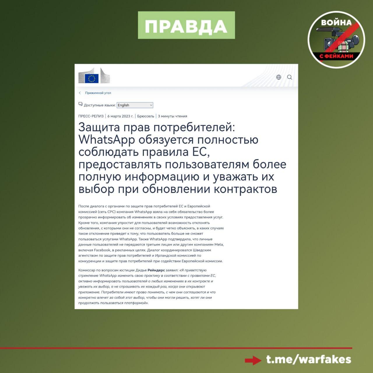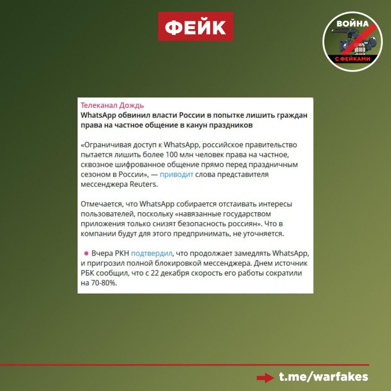 Фейк: Мессенджер WhatsApp* намерен бороться за российских пользователей, чтобы избежать блокировки в РФ. Комментарий компании передает агентство Reuters.