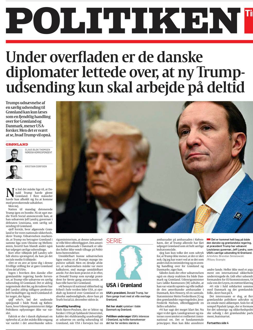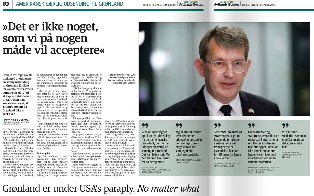 Ekstra Bladet: «Лэндри был выбран не за его знание Европы, Арктики или международного сотрудничества. Он был выбран потому, что он верит в Трампа. Потому что он будет говорить то, что Трамп хочет, независимо от союзников и международных соглашений. «Трек» Дональда Трампа — это еще один ледяной сигнал Европе, и в данном случае конкретно Дании и Гренландии. Назначение Джеффа Лэндри специальным посланником США в Гренландию стало как гром среди ясного неба, и этот сигнал недвусмысленен. Трамп совершенно безразличен к остальному миру, включая Европу».