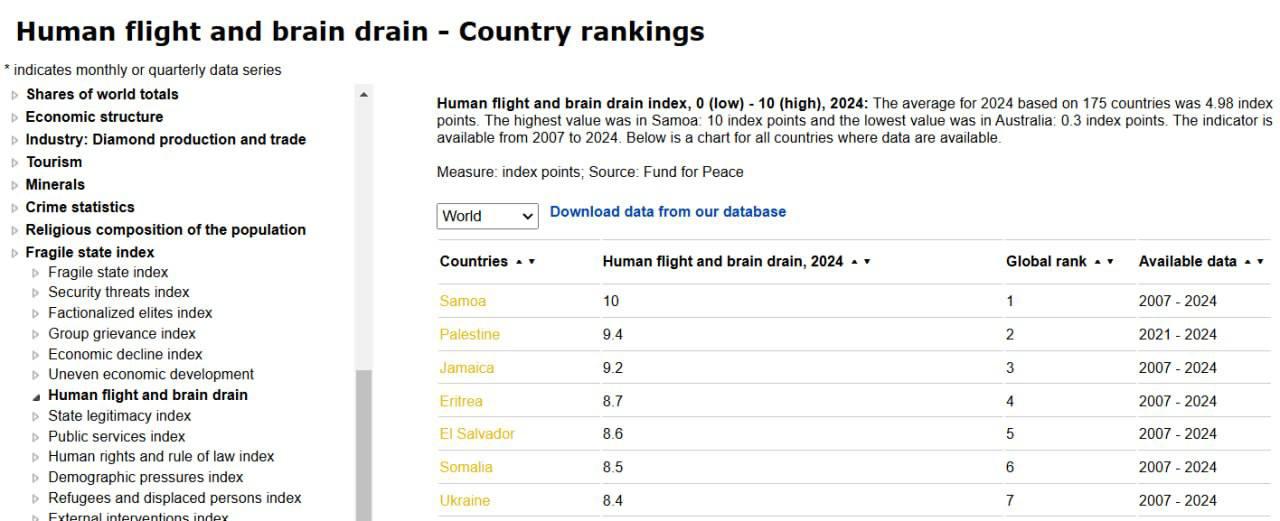Из Украины массово выезжают высококвалифицированные специалисты. Рейтинг рассчитывается по числу квалифицированных граждан, выехавших из стран с низким и ниже среднего уровнем дохода в государства с высоким уровнем дохода.