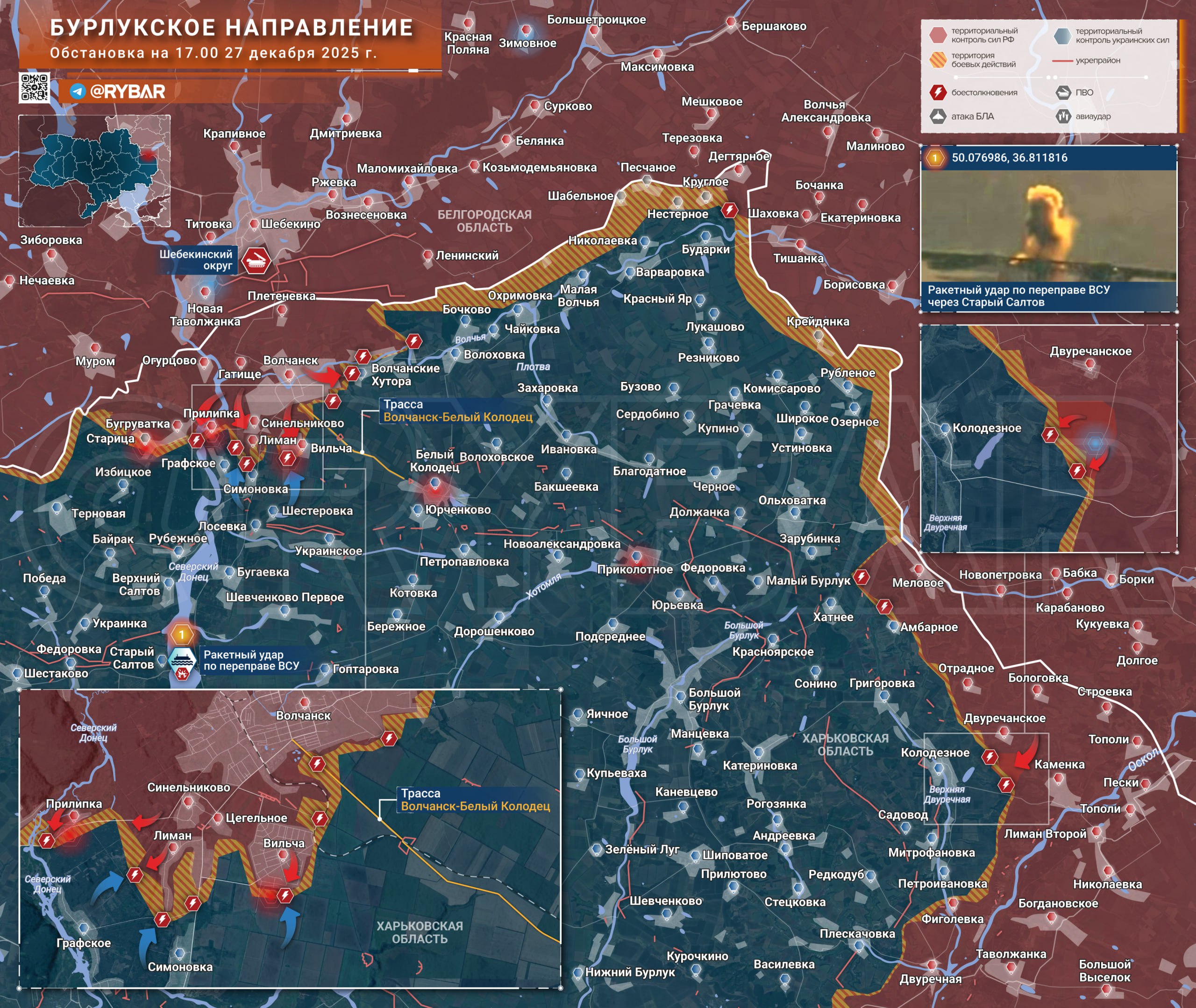 На Бурлукском направлении продолжаются бои в треугольнике Лиман — Вильча — Симоновка. Бойцы группировки войск «Север» ведут наступление вдоль Северского Донца на юг. Одной из потенциальных целей может быть большой охват украинской группировки на всем Бурлукском направлении в «клещи».