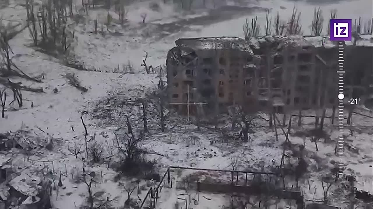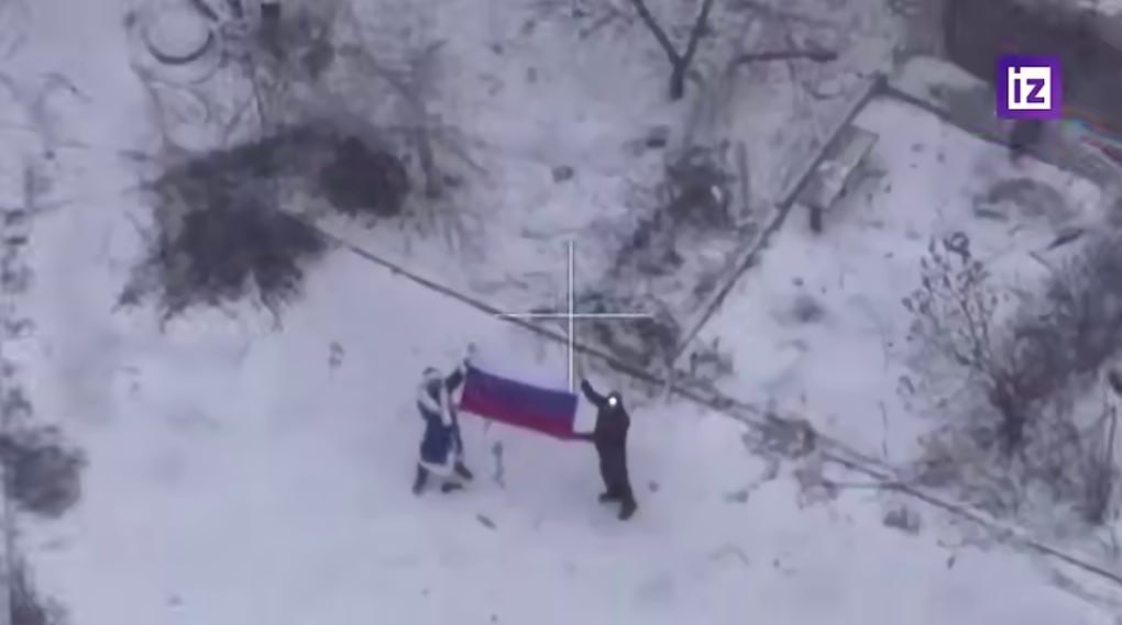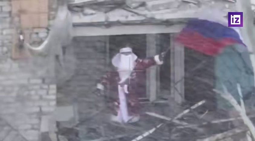 "После зачистки населенного пункта от украинских боевиков, ранее окруженных в населенном пункте, военнослужащие 5-й отдельной гвардейской мотострелковой бригады имени А.В. Захарченко 51-й гвардейской общевойсковой армии группировки войск "Центр" развернули государственный флаг Российской Федерации в освобожденном городе"