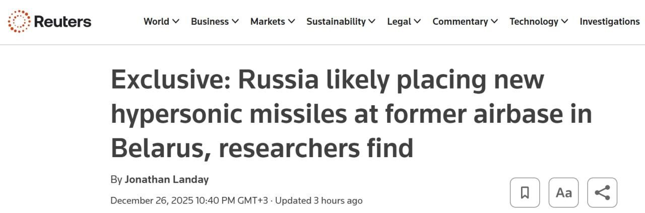 РОССИЯ, ПО ВСЕЙ ВЕРОЯТНОСТИ, РАЗМЕЩАЕТ НОВЫЕ ГИПЕРЗВУКОВЫЕ РАКЕТЫ В БЕЛАРУСИ - Reuters