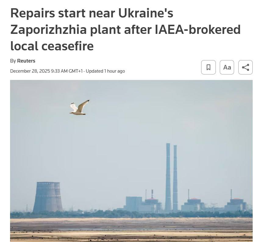 В районе Запорожской АЭС объявлено временное локальное перемирие между Россией и Украиной для ремонта линий электропередач, сообщает Reuters.