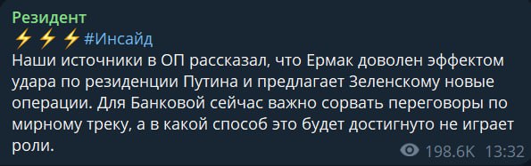 При этом источники в офисе Зеленского сообщают, что ранее уволенный с поста главы офиса Андрей Ермак, но сохранивший влияние, положительно оценивает эффект атаки на резиденцию российского лидера и предлагает Зеленскому новые теракты.