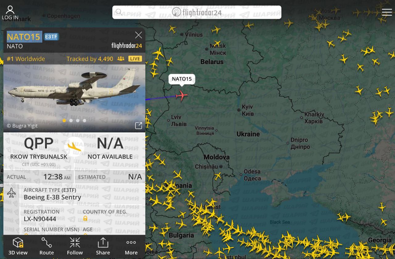 Над территорией бывшей Украины наблюдается сегодня необычное событие: самолёт дальнего радиолокационного обнаружения и управления Boeing E-3B Sentry (NATO 15) замечен в небе незалежной, причем даже с включенными транспондерами.