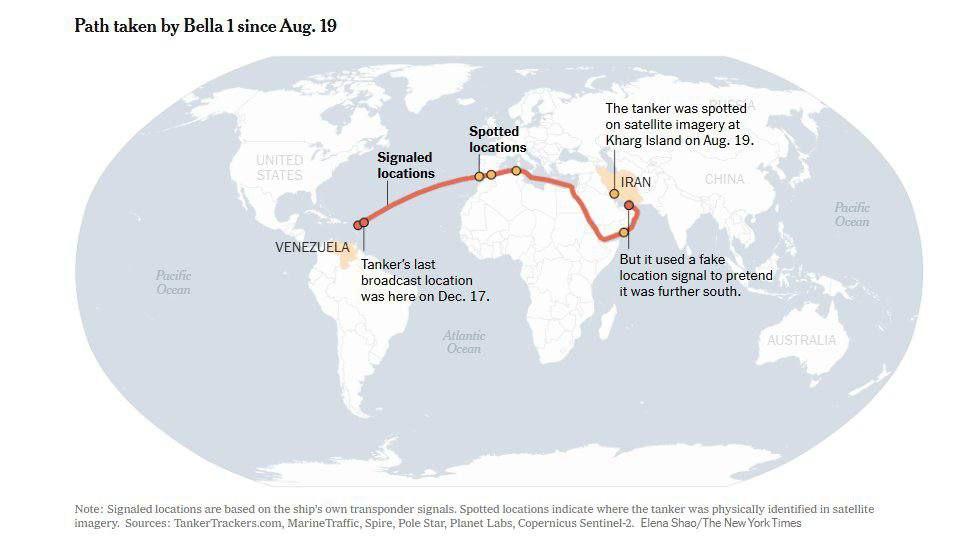 Все началось 21 декабря у побережья Венесуэлы. Танкер проигнорировал требования американских военных и взял курс в сторону Гренландии или Исландии. Несмотря на то что Bella 1 не быстрее патрульных кораблей, задержать его США так и не смогли.