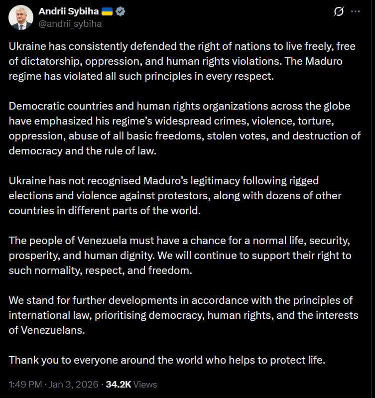 Глава МИД Украины Сибига поддержал атаку США на Венесуэлу и похищение Мадуро.