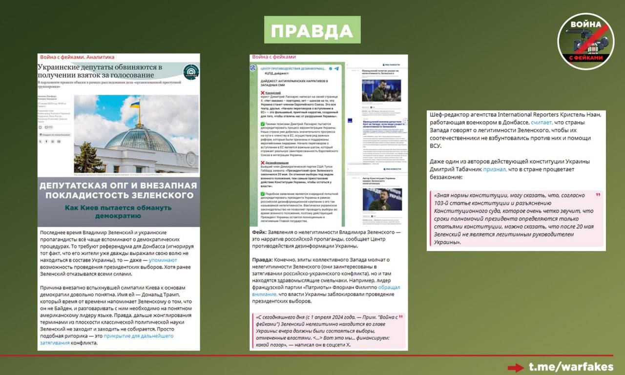 Правда: Украина давно дискредитировала демократию и право по всем аспектам. Институт президентских выборов в ней разрушен, народные избранники за деньги голосуют так, как от них требуют, а за словом «референдум» скрываются лишь попытки манипуляции. Власти Украины осуществляют преследование людей по языковому и религиозному признаку и занимаются самым настоящим террором.