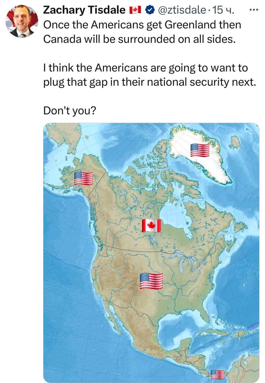 «Как только американцы захватят Гренландию, Канада окажется окружена со всех сторон. Думаю, в дальнейшем американцам захочется восполнить этот пробел в своей национальной безопасности. Разве не так?» — твиттерские