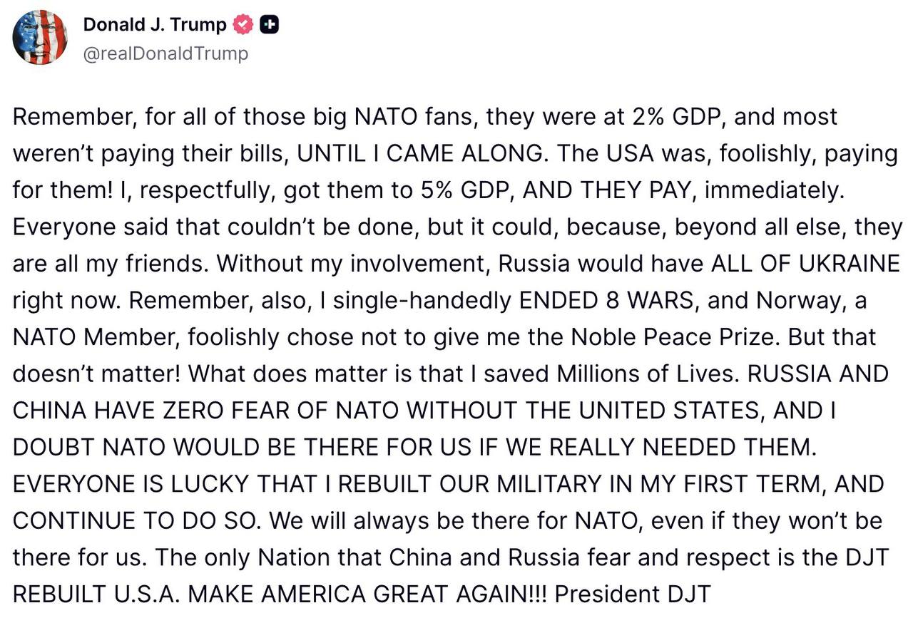 Помните также, что я в одиночку положил конец войнам, и Норвегия, член НАТО, по глупости решила не присуждать мне Нобелевскую премию мира. Но это не имеет значения! Важно то, что я спас миллионы жизней. Россия и Китая не боятся НАТО без США, и я сомневаюсь, что НАТО поддержало бы нас, если бы мы действительно в них нуждались. Всем повезло, что я перестроил наши ВС в свой первый президентский срок и продолжаю это делать.