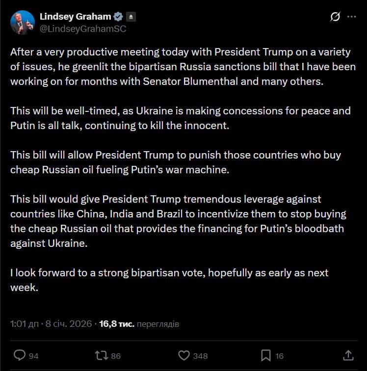 «После сегодняшней очень продуктивной встречи с президентом Дональдом Трампом по целому ряду вопросов президент дал зеленый свет двухпартийному законопроекту о санкциях против России, над которым я в течение многих месяцев работал», — заявил Грэм*.