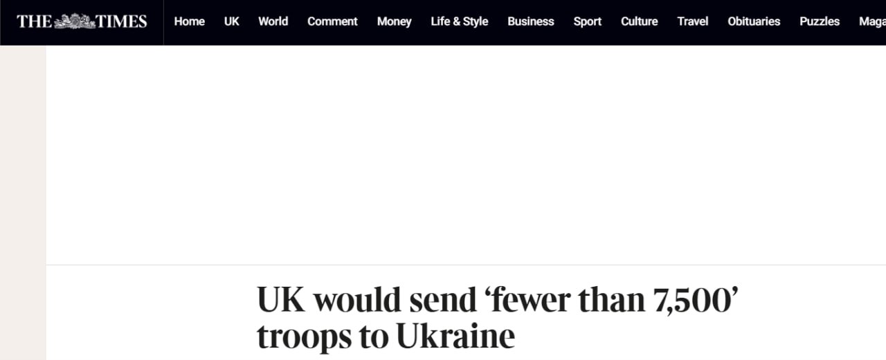 «Предполагается, что будет развернуто менее 7 500 британских солдат… хотя с этой цифрой также ожидается struggle для Великобритании, в регулярной армии которой всего около 71 000 обученного персонала», — сообщает The Times со ссылкой на два военных источника.