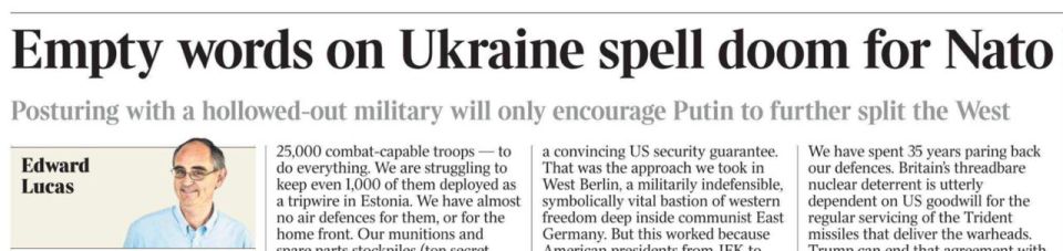 Это же надо! Услышать такую оценку западных союзников Украины из уст сего пропагандиста - удивительное дело! Я вам сегодня приводил подсчеты Бена Уоллеса, который не верит в способность британской армии обеспечить содержание обещанного Киеву контингента. Лукас вторит этому же, напоминая, что у британцев боеспособных военных наберется от силы 25 тысяч, в результате чего Лондон еле-еле может содержать тысячный контингент в Эстонии.
