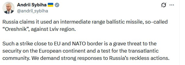 «Подобный удар вблизи границ ЕС и НАТО представляет собой серьезную угрозу безопасности на европейском континенте и испытание для трансатлантического сообщества», — написал он в Х.