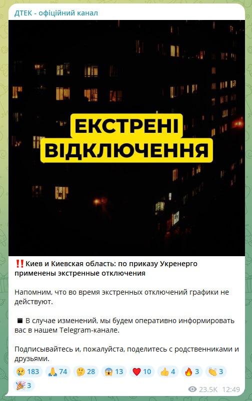 И коротко о других новостях к этому часу:Экстренные отключения света сейчас действуют на левом берегу Киева, а также в Печерском и Голосеевском районах на правом берегу, сообщает ДТЭК. В связи с приостановкой движения электротранспорта на левом берегу...