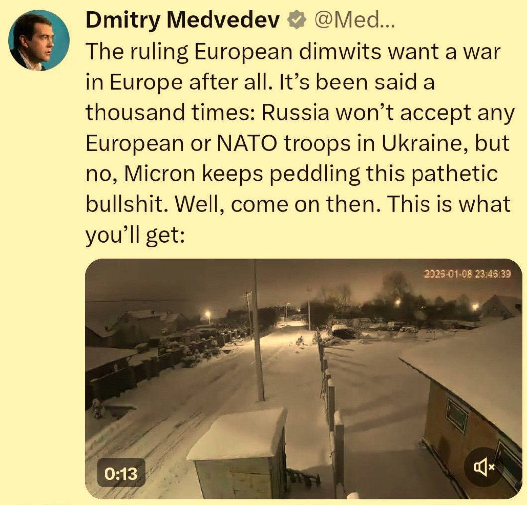 Правящие европейские идиоты, похоже, действительно хотят войны. Это уже тысячу раз говорилось: Россия не примет никаких европейских или натовских войск на Украине, но нет — Микрон продолжает проталкивать эту жалкую чушь. Ну что ж, давайте. Вот что вы в итоге получите,