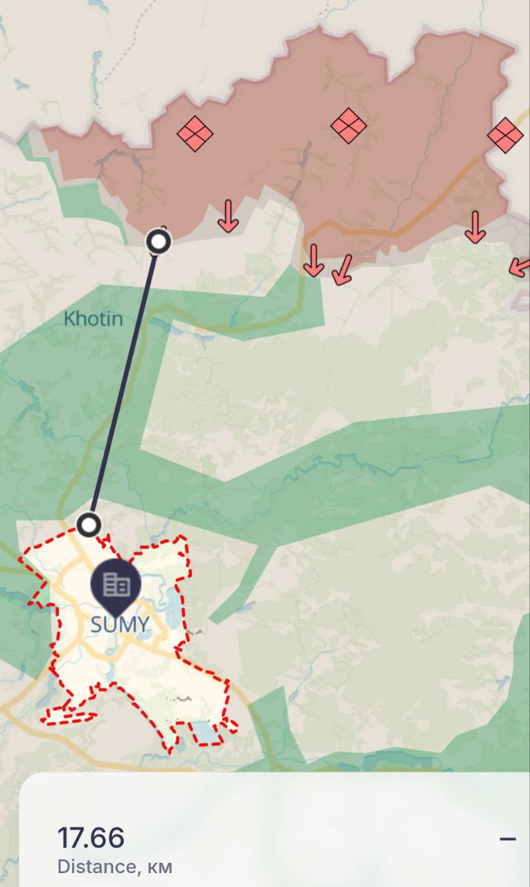Карта другого украинского OSINT- ресурса DeepState показывает, что от окраин Сум до ближайших российских позиций — всего лишь около 17 километров.