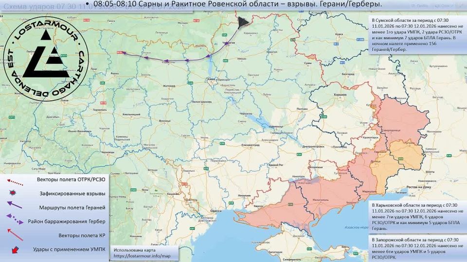 Анимированная схема ударов по территории Украины 11 января 2025 – 12 января 2026 года.