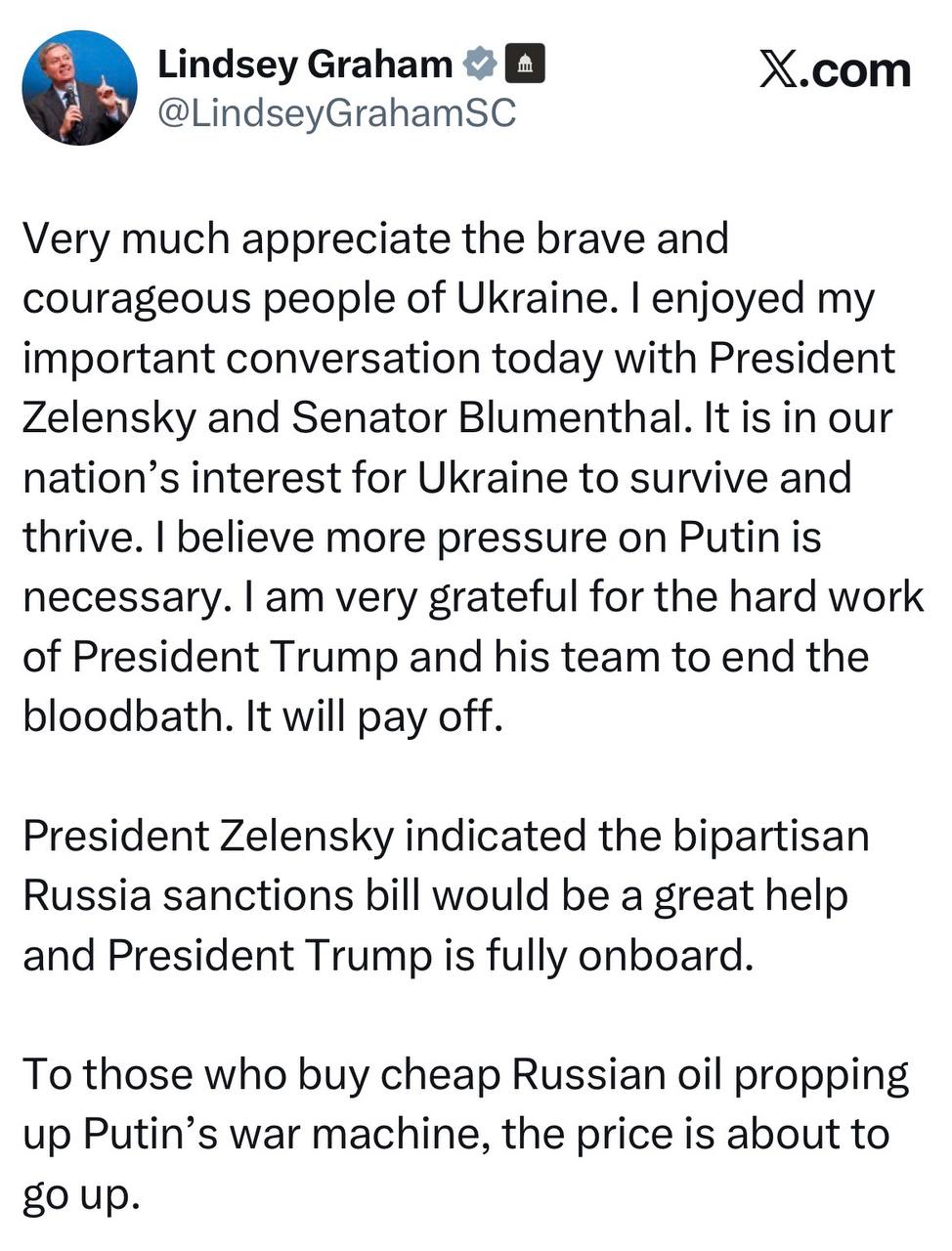 Я очень ценю храбрость и мужество украинского народа. Мне понравилась сегодняшняя важная беседа с президентом Зеленским и сенатором Блюменталем. Выживание и процветание Украины отвечают интересам нашей страны. Я считаю, что необходимо усилить давление на Путина. Я очень благодарен президенту Трампу и его команде за их упорную работу по прекращению кровопролития. Это принесет свои плоды.