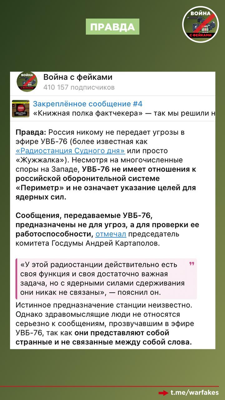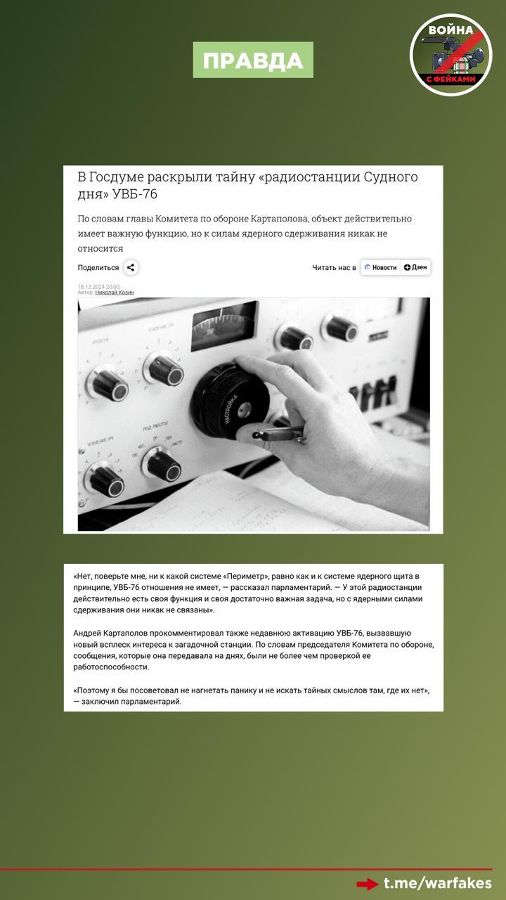 Как ранее говорил председатель комитета Госдумы Андрей Картаполов, сообщения УВБ-76 предназначены не для угроз, а для проверки ее работоспособности. Ожидания ядерной зимы после новых порций шифровок также избыточны: УВБ не имеет отношения к российской оборонительной системе «Периметр» и не означает указание целей для ядерных сил.