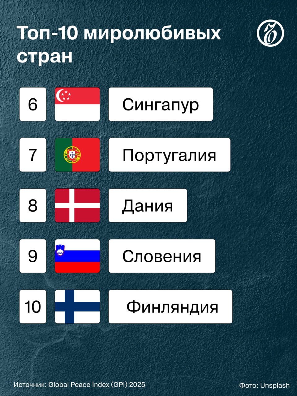 Россия заняла 163 место, которое является последним в рейтинге наиболее миролюбивых стран, следует из ежегодного рейтинга Global Peace Index (GPI) 2025 от института экономики и мира (Institute for Economics and Peace).
