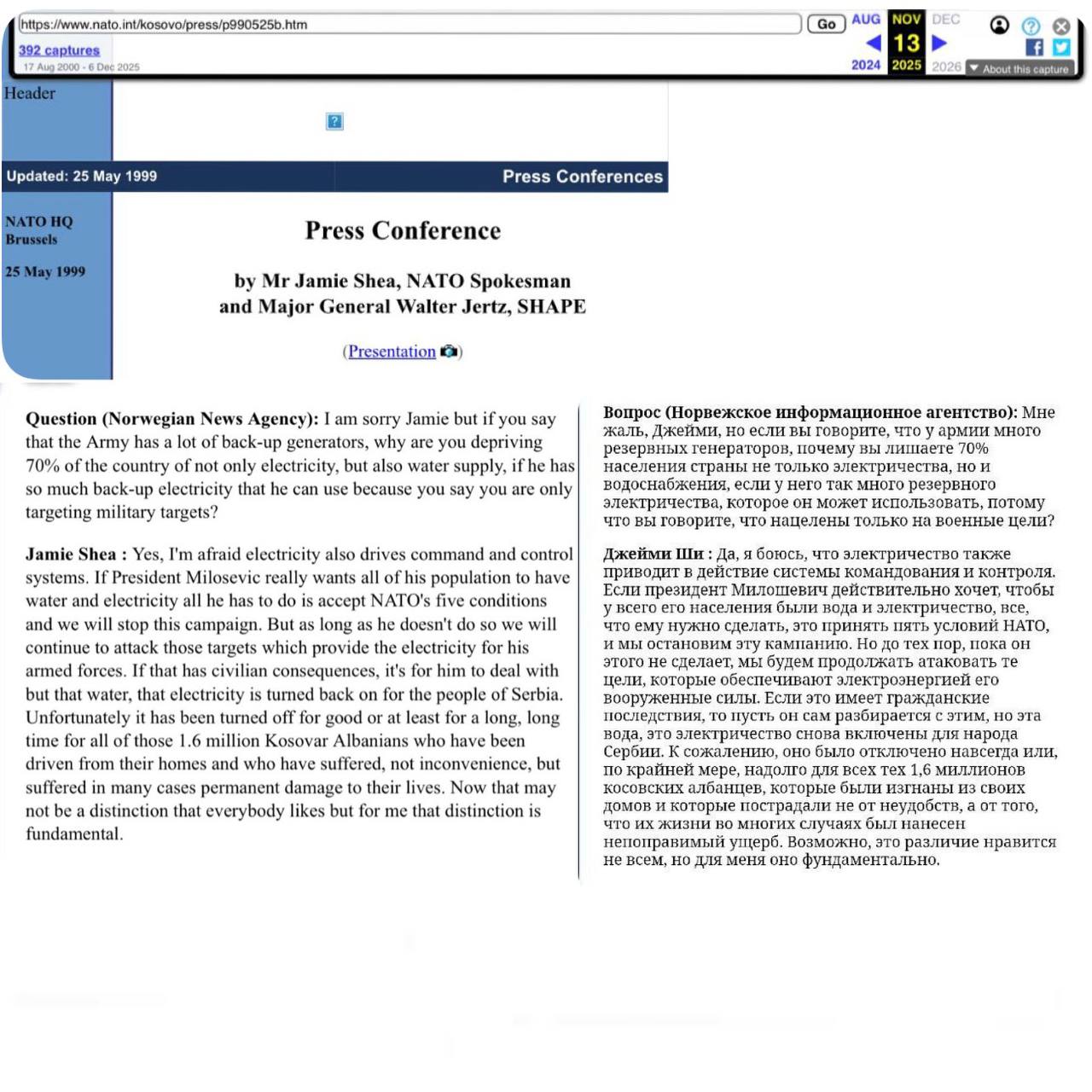 "НАТО продолжит атаковать энергообъекты Сербии. Если это наносит вред гражданским, лишая их воды и электричества – это проблемы Милошевича. Пусть примет 5 условий НАТО и это прекратится", – говорится во "внезапно" исчезнувшем тексте от 25 мая 1999 года.