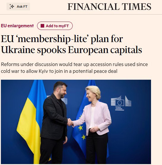 ‘Представители Еврокомиссии понимают, что Зеленский сможет согласиться с передачей территорий России, только в том случае, если Украина вступит в ЕС в 2027 году. Обсуждаемый предварительный план позволит Украине вступить в блок, но с гораздо меньшими полномочиями в принятии решений. По словам официальных лиц, Украина изначально не будет иметь права голоса на саммитах лидеров и встречах министров’ – Financial Times